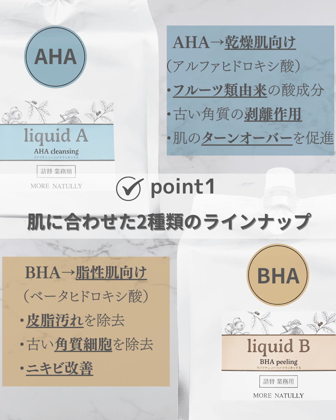 ■BHA(ベータヒドロキシ酸)・・・・脂溶性。サリチル酸とも呼ばれます。肌の奥まで浸透し、毛穴詰まりの原因となる皮脂汚れや古い角質細胞を除去する効果がある為、ニキビ改善にも期待できます。